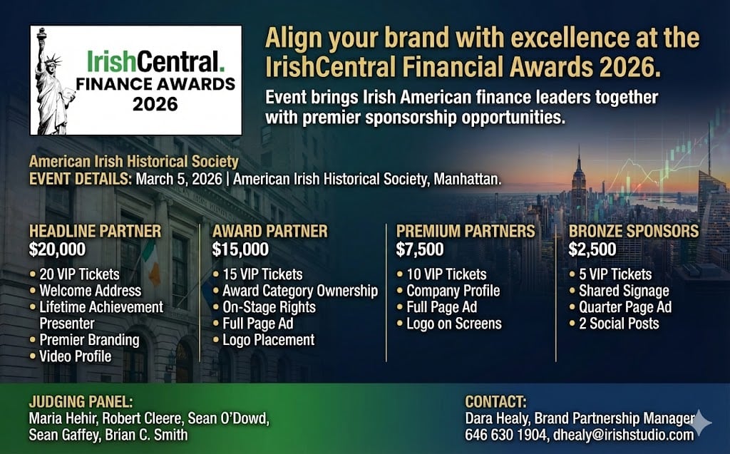 The inaugural IrishCentral Financial Awards will take place on March 5, 2026, at the American Irish Historical Society in Manhattan and promise a focused audience of Irish American leaders across banking, investing, fintech, insurance, and asset management. This night is designed to spotlight excellence while offering sponsors direct access to decision makers and influencers in the Irish diaspora finance community.