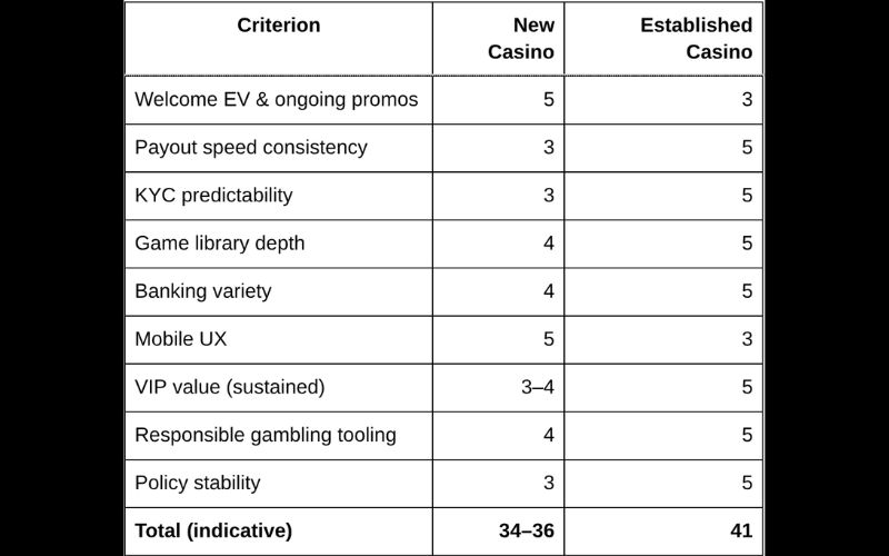 - Choose established casinos if you want predictable payouts, broader games, VIP consistency, and no surprises—and you’re fine with less generous welcome offers.