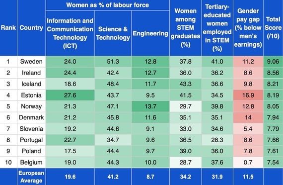 Ireland landed in second place (8.56/10) with a high proportion of women employed in ICT and engineering roles compared to the European average.
