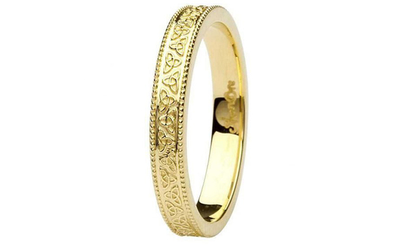 This attractive 14-karat yellow gold wedding ring from Shanore features a classic, gorgeous Celtic knot pattern and a delicate ridge border.