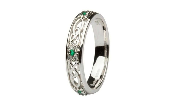 This lovely 14-karat white gold wedding ring from Shanore features clustered diamonds, a flawless emerald center, and a Celtic knot design.