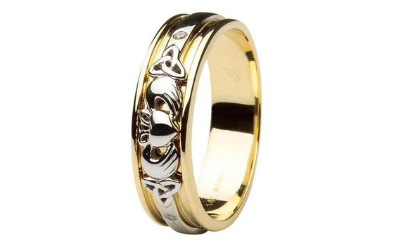 This handsome 14-karat yellow and white gold wedding ring from Shanore features a Claddagh design (love, loyalty & friendship) and Trinity knots (eternity).