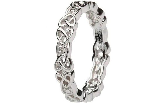 This stunning Shanore Jewelry wedding band is delicately crafted from sterling silver in a lovely interwoven heart and Celtic knot design.