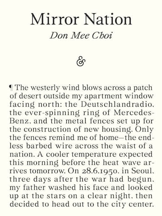 "Don Mee Choi’s Mirror Nation is the last in her trilogy of works that combine poetry, documentary, photography and philosophy to create art of astonishingly radical and political potential. Choi’s father was a photographer, whose job took him to zones of conflict and unrest. In Mirror Nation Choi counterpoints the history of two divided nations, Germany and Korea, through her father’s photographs. The resulting work comments on the philosophy of history with rare lyric grandeur."