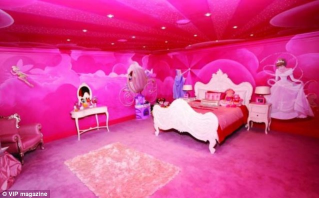 In front of a 10 foot high aquarium stands a customized black pool table with Ireland’s name stitched into felt in giant silver letters. Their five year old daughter’s room is decorated from ceiling to floor in a shade of pink known as Barbie’s Kidney.