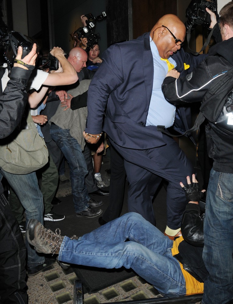 The 'Friends with Benefits' actor was joining his co-star Mila Kunis – who he his rumoured to be dating - at London's exclusive Nobu restaurant on Tuesday night when a smartly-dressed man, believed to be his security assistant, was seen punching a photographer to the floor.