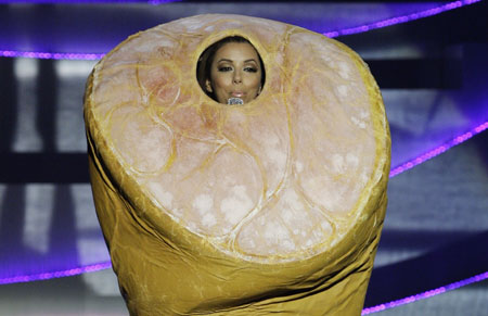 The “Desperate Housewives” star who hosted the award ceremony bounced onto the stage last night in a full ham suit. The 35-year-old star wore 13 different outfits last night during the ceremony in Madrid.