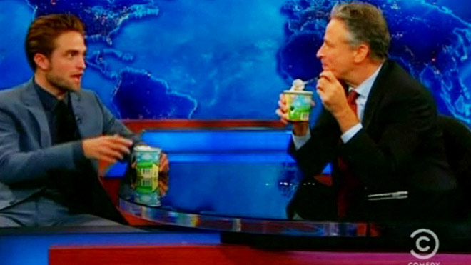| Robert Pattinson gets cosy with Jon Stewart |