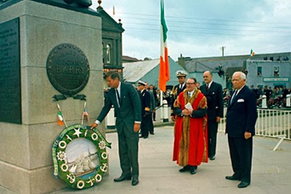 | President John F. Kennedy lays a wreath at the John Barry Memorial in New Ross, Co. Wexford during his visit in June, 1963. |