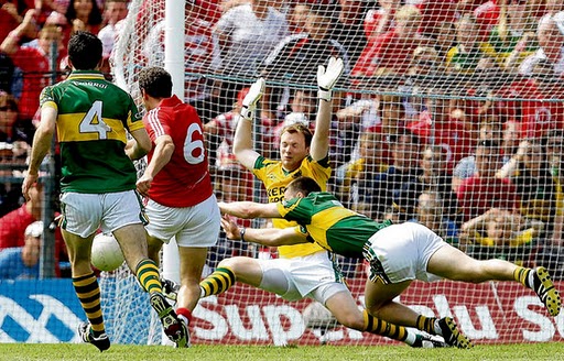 Kerry goalkeeper Brendan Kealy and Killian Young combine to try and block a shot from Cork's John Miskella. |