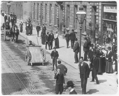 Most “Topicals” were shot on other side of the Irish Sea, but here are two made in Ireland, starting with a pre-auto Belfast streetscape shot in 1901 from the top of a double-decker horse-drawn tram.