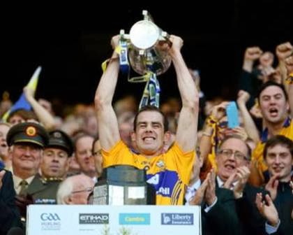 | Clare captain Patrick Donnellan lifts the Liam MacCarthy Cup at Croke Park on Saturday. |
