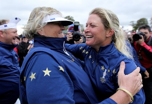 | Suzann Pettersen of Europe celebrates her team's victory on the 18th green with Laura Davies at Killeen Castle Golf Club in County Meath, Ireland. (Photo by Andy Lyons/Getty Images) |