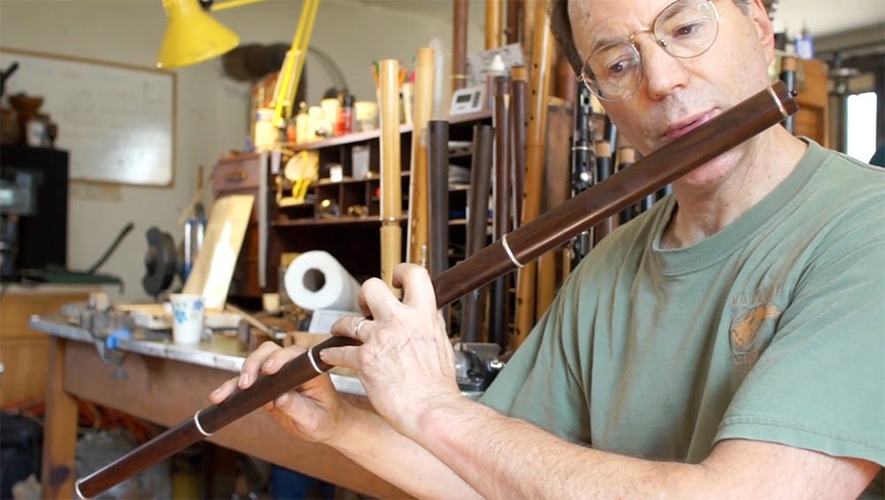 The documentary fills in the essential background on Olwell, a native of Cincinnati who discovered an interest in making flutes while in college in Massachusetts when influenced by South American music played on bamboo flutes. Selling them for $5 a flute was more lucrative than the college library job he had, and more satisfying as he was also starting on a path that define his life’s work from then on.