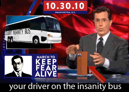But I'm not going to Jon Stewart's rally. I'm going to the Stephen Colbert March to Keep Fear Alive. I'm not sure there's a place on the sanity ride for people Howling on the edge.