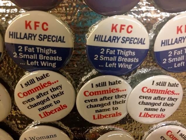 A vulgar button on sale at the Republican Convention in Anaheim, CA, likened the Democrat Hillary Clinton to a hen with "2 fat thighs, 2 small breasts… left wing".