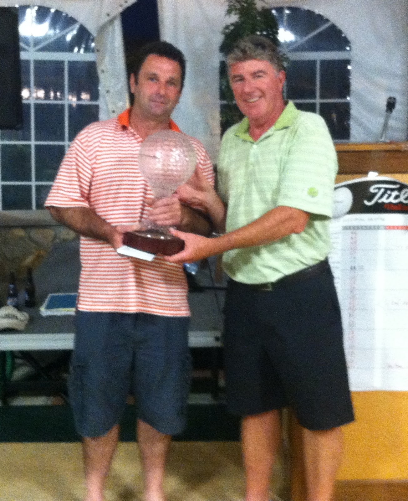 Brian Kennedy, Chair of the ICC Golf Tournament awards winner's trophy to Steve Mitchell and his foursome. |