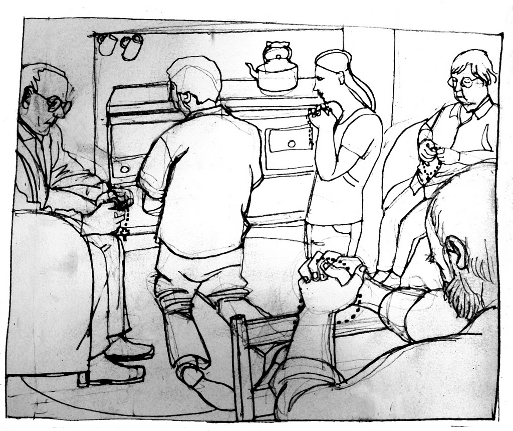 It was an echo of yesterday's Ireland; of my Ireland. My hesitation was only for a second. I opened the unlocked door and walked down the hallway into the kitchen. The man and wife and their two adult children were circled around the hearth and they were saying the family Rosary.