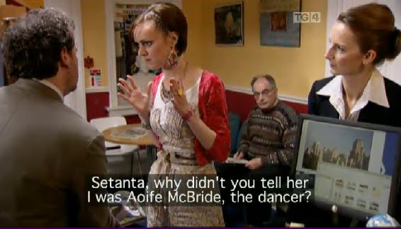 Setanta is the curly-haired acting head. Act being the key word and his shtick. While waffling on as Gaeilge about a shite film his nephew was paid 60,000 euro to make in Irish--knowing none, the nephew took the money, and made a silent film instead (fíor-cliste, go deimhin)--Setanta shows us his heroic appellation is something less than serious.