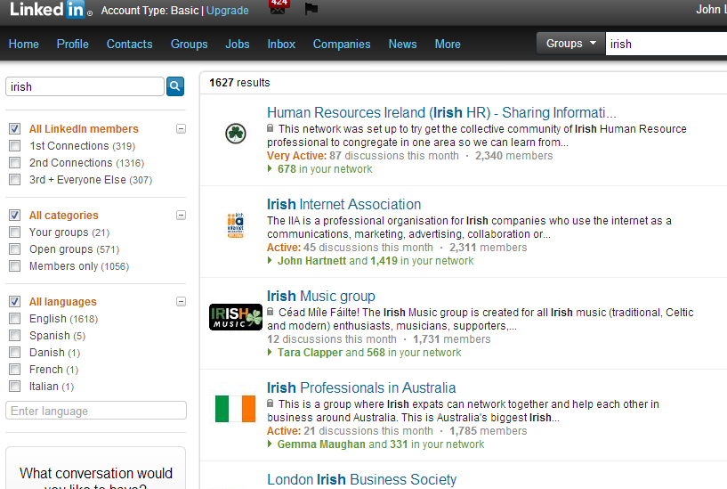 And it has Groups, lots of Groups, about 1.6 million online gatherings of people, usually with something professional in common where members share news, tips, links, questions and comments. Many groups are focused on a particular a country, or made up of people with ties to that country, such as Ireland and the Irish worldwide.