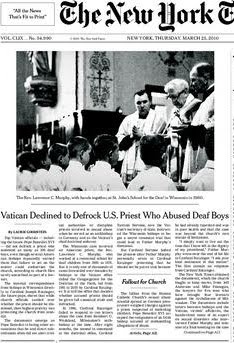 The story the Times tells is another one about a priest who violated his vows, the innocence of children and the trust of their parents. Fr. Lawrence Murphy was an Assistant Director, Director and eventually Principal at St. John's School for the Deaf, a residential school in Milwaukee, from 1950 – 1974.
