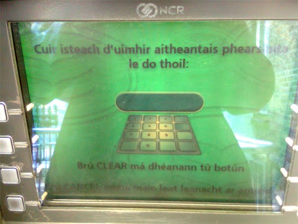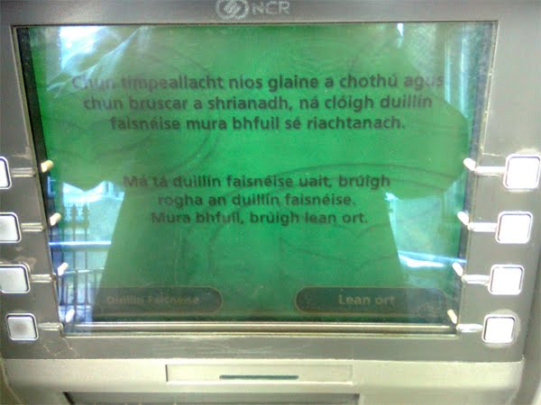 The language option "Gaeilge" is currently available on ATMs in the Republic of Ireland. Delays in the Language Act--a central pilar of the Peace Process in northern Ireland--have slowed moves there in violation of agreed timetables.