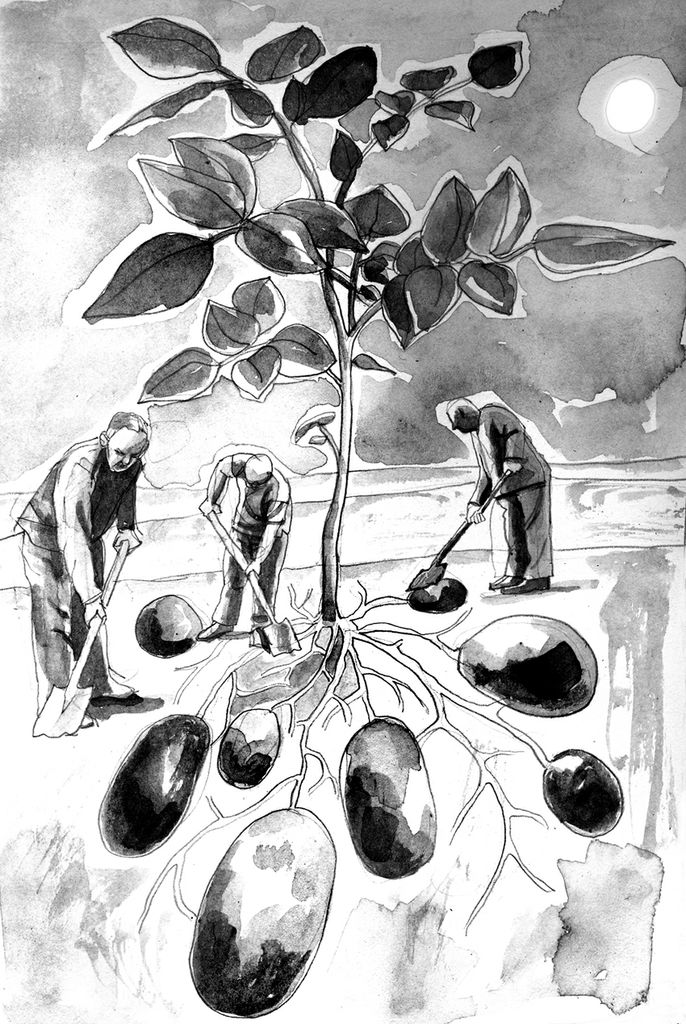 In our country at that time the early crop of potatoes were from a variety known as Epicures. They were truly pampered in their garden ridges, gently molded up when they first shoved up their green heads above the earth, kept weed-free, sprayed with bluestone (copper sulphate) against the blight which caused the Famine in its time and, when ready for eating, almost tenderly dug up with sharp spades which always somehow avoided cutting their white skins.