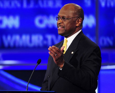 | Herman Cain at the GOP debate in New Hampshire on Monday night |