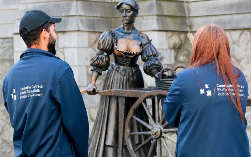 May 2025: Dublin City Council stewards keep an eye on the Molly Malone statue. (RollingNews.ie)