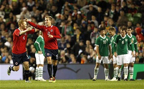 Yet another drab night of Irish football under Giovanni Trapattoni. Last night an admittedly under-strength Irish side were beaten by Norway, in our own backyard, the New Lansdowne Road, 1-2. Ireland got off to a great start when one of our more enterprising and promising prospects, 23 year old Shane Long, scored from the penalty spot.