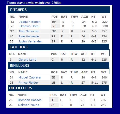 When asked about the award Justin Verlander, a hefty 225lbs, mentioned that it was really a team effort, and paid particular credit to some of the ‘other’ guys, not just Fielder, Valverde and Cabrera. ‘Hey you know what, we were all in this together, no way we tilt the scale in our favour without Delmon and Brennan’. The ace was of course referring to Delmon Young and Brennan Boesch, Detroit’s starting corner outfielders, who weigh in at 240lbs and 235lbs respectively.