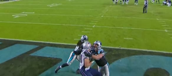 Brady's pass was picked off for an interception as Gronkowski watched helpless, unable to intervene as Kuechly executed a perfect bear-hug on him.