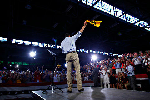 Republican candidate Paul Ryan waving the Terrible Towel of the Wisconsin Packers |