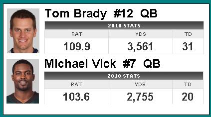 Let us imagine for argument sake the MVP award was handed out today and let's have a look at Vick against who most sane people are touting as MVP (Peyton Manning basically threw himself out of the ring with that unfortunate interception binge a few weeks ago, Philip Rivers Chargers are not too far detached from a .500 record), Tom Brady.